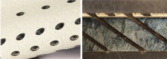 英國(guó)溫伯樂公司(Winbro)采用激光打孔技術(shù)對(duì)不同涂敷厚度的熱障涂層進(jìn)行了不同角度激光打孔試驗(yàn)。通過優(yōu)化激光打孔和涂層涂覆工藝參數(shù)可以避免陶瓷面層分層和粘結(jié)層/高溫合金基體界面裂紋的產(chǎn)生。圖5為打孔后的熱障涂層表面和截面形貌照片。該工藝采用的GUI控制軟件可以讓每個(gè)脈沖具有不同的激光參數(shù)。在陶瓷面層打孔時(shí)使用正確的峰值功率/脈沖能量組合以降低激光束能量對(duì)界面的熱損傷,當(dāng)打到基體時(shí)應(yīng)采用足夠高的峰值功率,以便在很短的時(shí)間內(nèi)完成打孔,減少氣膜孔孔徑內(nèi)重熔層的產(chǎn)生。據(jù)了解,Winbro公司對(duì)燃燒室涂層(基體2mm厚,涂層0.35mm厚)進(jìn)行20°、0.52mm直徑氣膜孔加工時(shí),重熔層平均厚度為20μm TBC;對(duì)渦輪葉片涂層(基體3mm厚,涂層0.65mm厚)進(jìn)行30°、0.65mm直徑氣膜孔加工時(shí),重熔層平均厚度為29μm 。