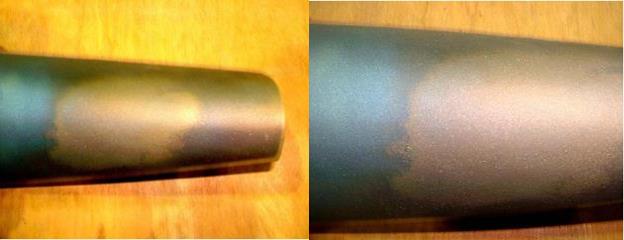 對(duì)于金屬粘結(jié)底層主要采用化學(xué)法和高能粒子轟擊法去除。涂層的去除程度可以通過熱著色方法判斷。先用120~250目沿葉型方向以較小的壓力在葉片表面吹砂,然后將清潔的葉片置入空氣循環(huán)爐內(nèi)加熱到510~590℃保溫1h,空冷,目視檢驗(yàn)葉片顏色。藍(lán)色表示涂層已完全去除,稻草色或金黃色表示涂層未完全去除(如圖10所示)。