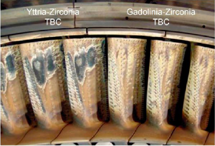 國(guó)內(nèi)外針對(duì)CMAS的防護(hù)進(jìn)行了大量的研究,主要有以下幾個(gè)方面,一是阻止CMAS熔化后的滲入(在表層的粘附往往有滲透的現(xiàn)象,可以形成致密層,阻止CMAS的滲入),二是阻止?jié)B入后引起的氧化鋯晶型轉(zhuǎn)變(一些促進(jìn)形核的物質(zhì),或者使CMAS產(chǎn)生結(jié)晶,如產(chǎn)生氧化鋁晶體和尖晶石相,不再滲透等),三是阻止在陶瓷層的上部(滲入?yún)^(qū)域)產(chǎn)生壓縮、致密層效果(極易產(chǎn)生很大的應(yīng)力和熱不匹配,是引起失效剝落的主要因素之一)等。美國(guó)Pratt & Whitney Aircraft公司通過對(duì)比傳統(tǒng)YSZ熱障涂層與新型PWA 36309GdxZr1-xO2-x/2熱障涂層在X47的試車結(jié)果表明(如圖7所示),新型GdxZr1-xO2-x/2熱障涂層具有良好的抗CMAS腐蝕性能。